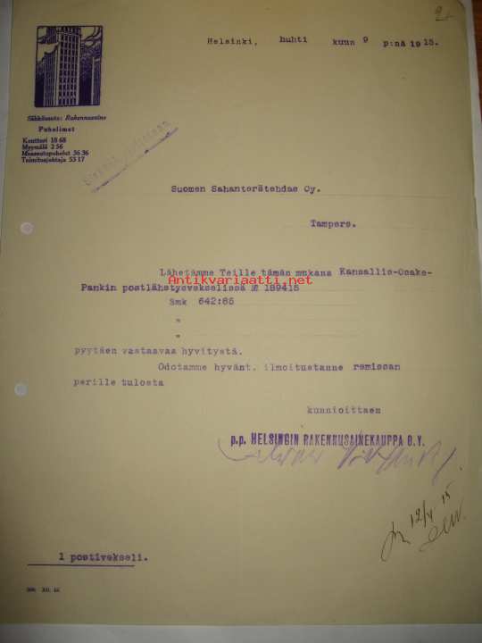 Helsingin rakennusainekauppa oy, Helsinki 9.4 1915 asiakirja