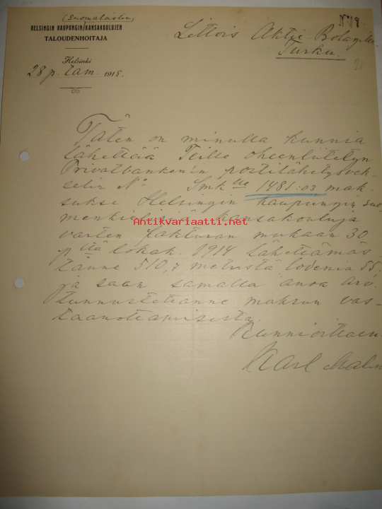 Helsingin kaupungin suomalaisten kansakoulujen taloudenhoitaja, Helsinki 28.1 1915 asiakirja