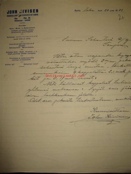 John Kivisen koneellinen kivenveistämö, Raahe 20.10 1923 asiakirja
