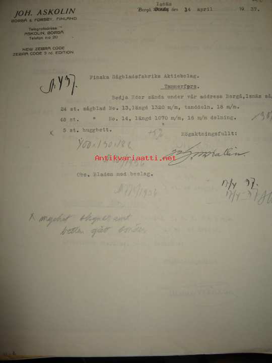 Joh. Askolin, Isnäs 14.4 1937 asiakirja