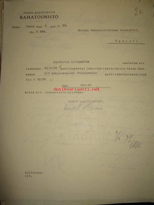 Porin kaupungin rahatoimisto, Pori 2.5 1939 asiakirja