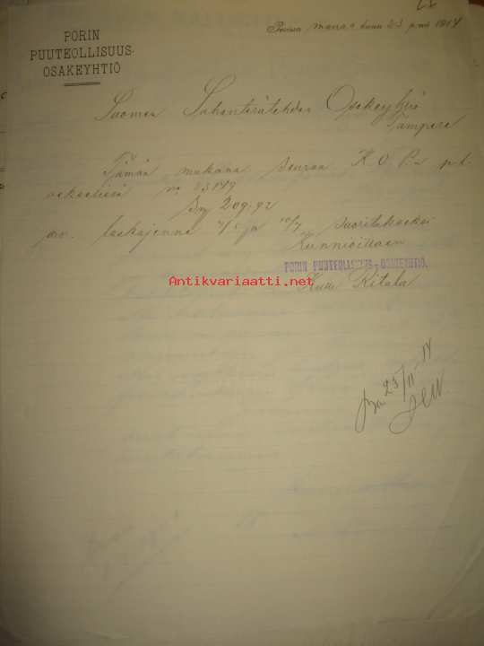Porin puuteollisuusosakeyhtiö, Pori 24.11 1914 asiakirja