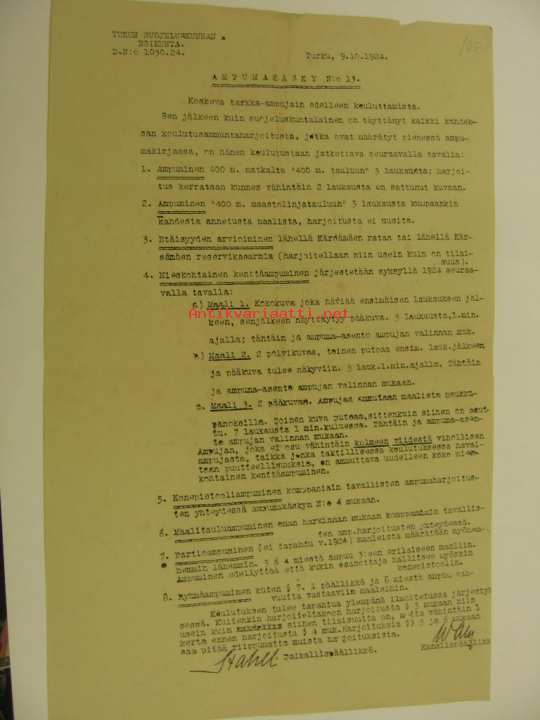 Ampumakäsky nro 13 Suojeluskunta Turku 9.10.1924