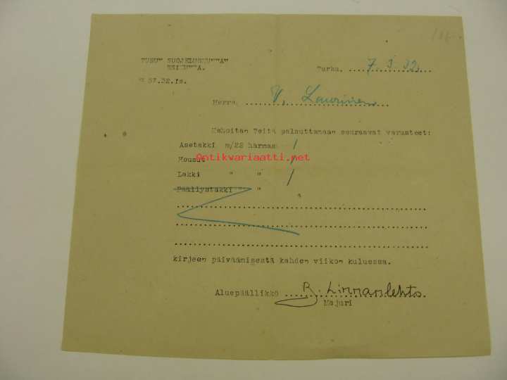 Turun Suojeluskunta varustepalautus -asiakirja 7.3.1932