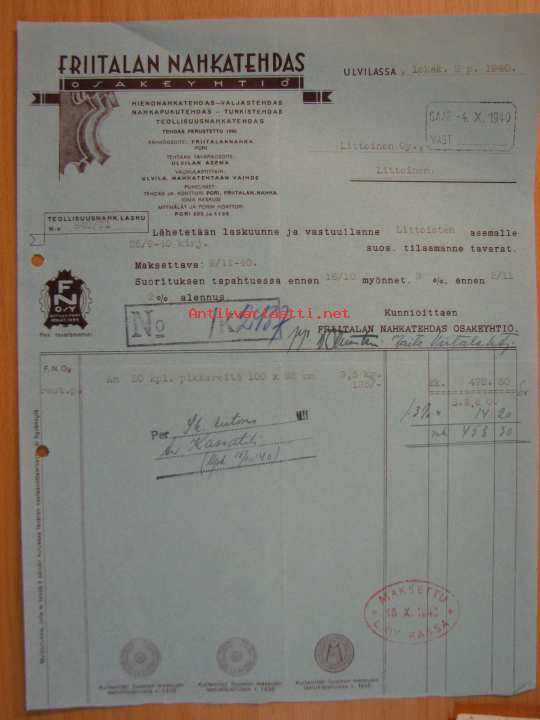 Friitalan Nahkatehdas Ulvila 2.10.1940 -asiakirja