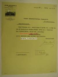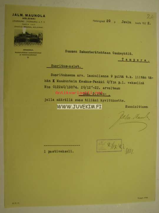 Jalm. Maunola Helsinki 20.12.1922 -asiakirja
