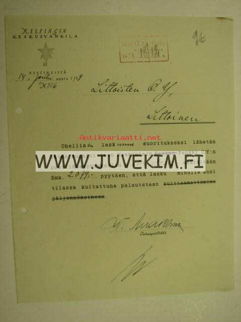 Helsingin Keskusvankila 14.12.1929 -asiakirja