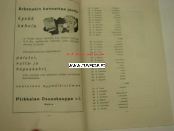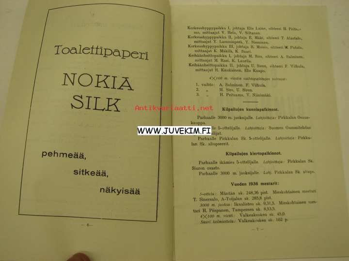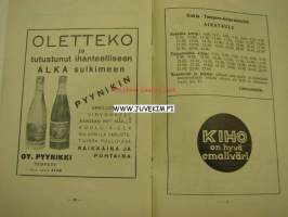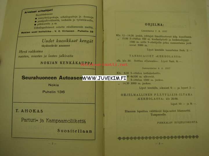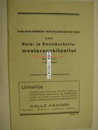 Pohjois-Hämeen Suojeluskuntapiirin XVIII Rata- ja kenttäurheilumestaruuskilpailut 7-8.8.1937 Nokia -käsiohjelma, kannes Kalle Kaihari -liikkeen mainos
