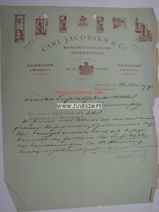 Carl Jacobsen Maskinutställning - Konenäyttelö Helsinki 26.3.1890 -asiakirja