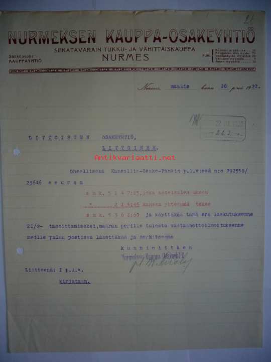 Nurmeksen Kauppa-Osakeyhtiö Nurmes 20.3.1922 -asiakirja