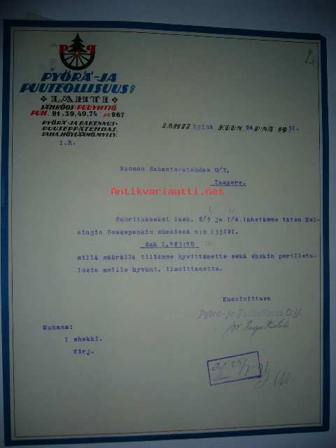 Pyörä - ja Puuteollisuus Lahti 24.7.1931 -asiakirja