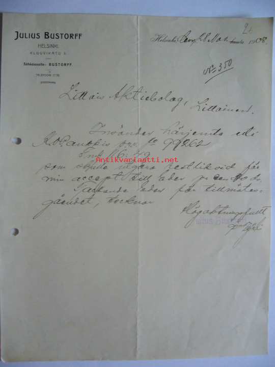 Julius Bustorff Helsinki 28.11.1908 -asiakirja