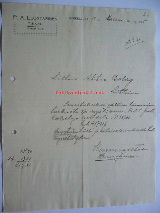 P.A. Luostarinen Mikkeli 12.11.1915 -asiakirja