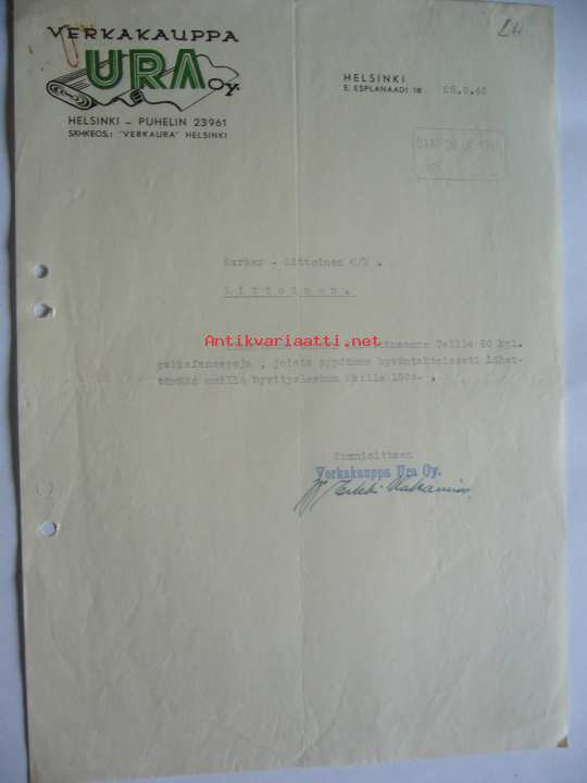 Verkakauppa Ura Oy Helsinki 25.9.1945 -asiakirja