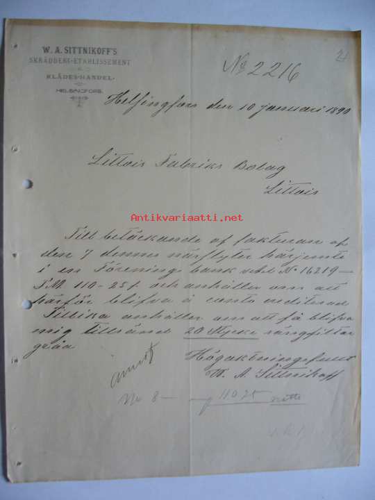 W.A. Sittnikoff's Skrädderi-Etablissement Helsingfors/Helsinki 10.1.1890 -asiakirja