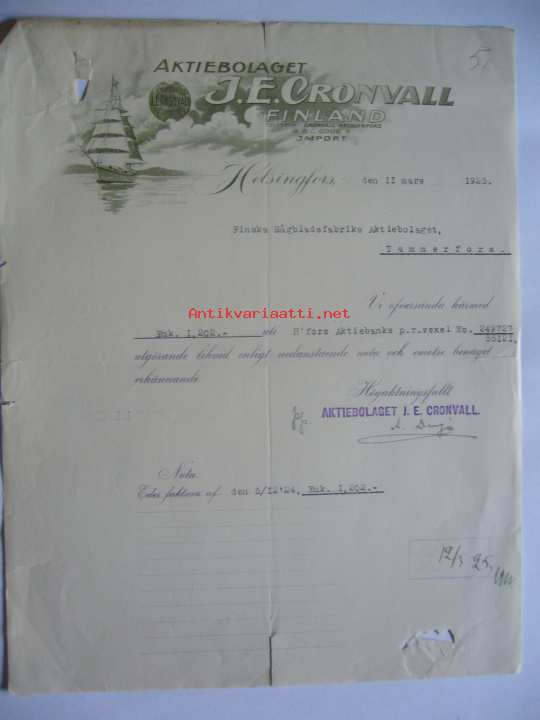 Aktiebolaget J.E. Cronvall Finland Helsingfors/Helsinki 11.3.1925 -asiakirja