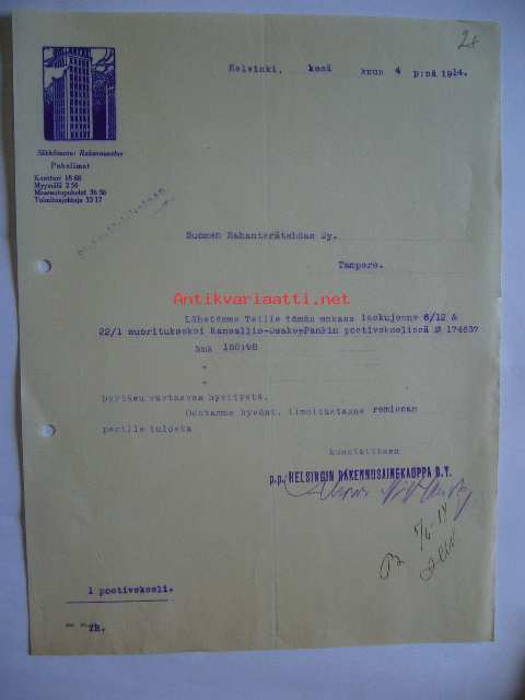 Helsingin Rakennusainekauppa O.Y. Helsinki 4.6.1914 -asiakirja