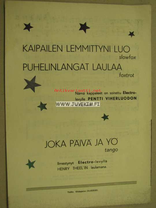 Kaipailen lemmittyni luo -nuotit Pentti Viherluoto