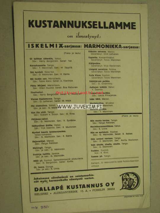 Muistojen yö foxtrot, Kullervo Linna -nuotit