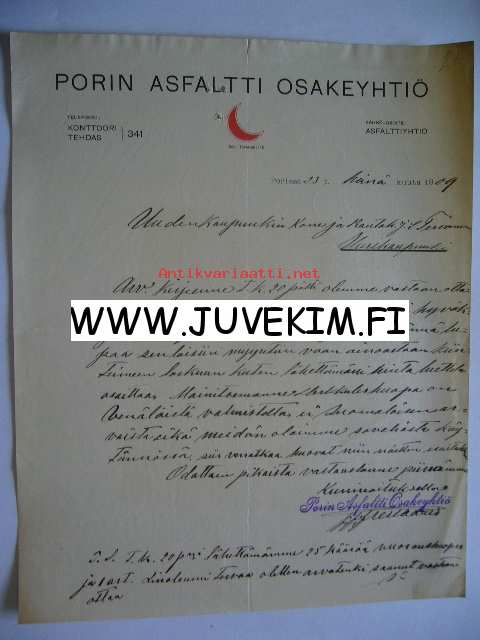 Porin Asfaltti Osakeyhtiö Pori 23.7.1909 -asiakirja