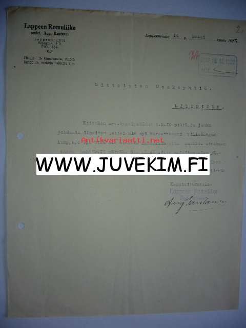 Lappeen Romuliike Lappeenranta 14.2.1922 -asiakirja