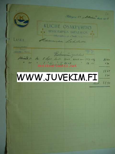 Kliché Osakeyhtiö Kemigrafinen Taidelaitos Helsinki 31.7.1913 -asiakirja