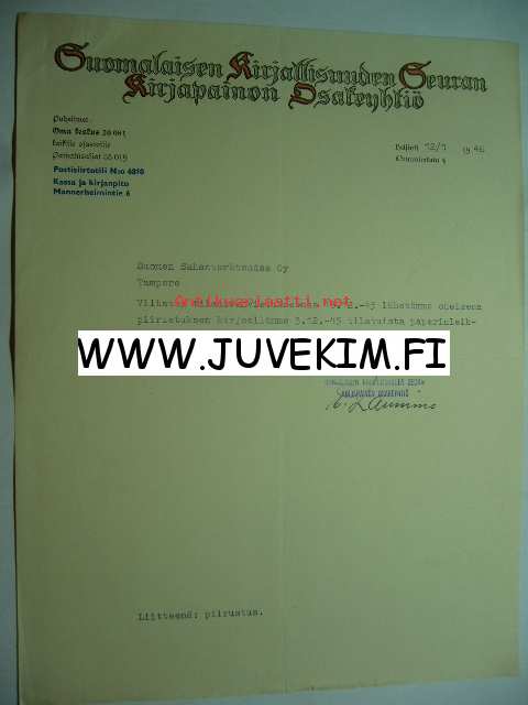 Suomalaisen Kirjallisuuden Seuran Kirjapainon Osakeyhtiö Helsinki 12.1.1946 -asiakirja