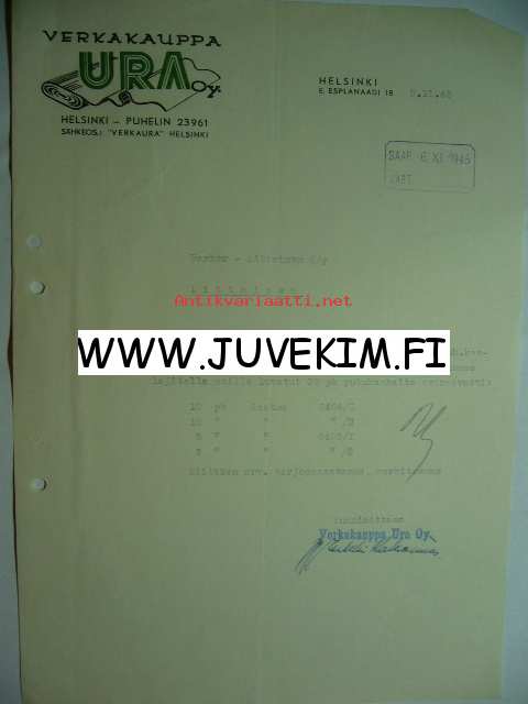 Verkakauppa Ura Oy Helsinki 5.11.1945 -asiakirja