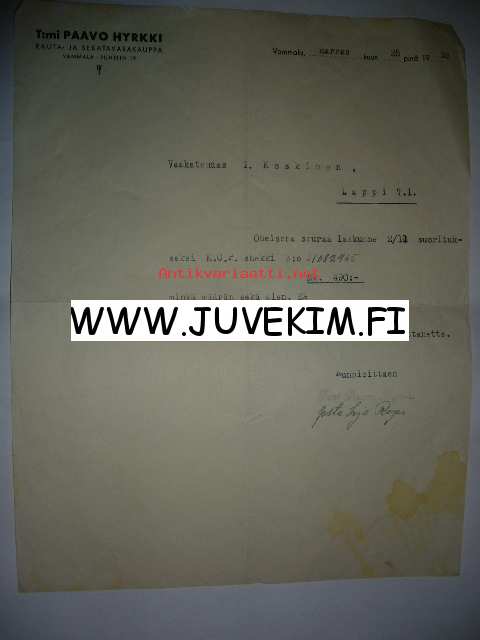 T:mi Paavo Hyrkki Rauta- ja Sekatavarakauppa Vammala 25.11.1938 -asiakirja