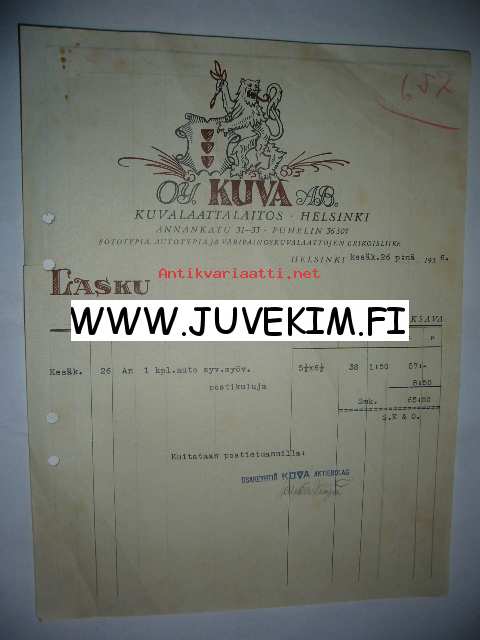 OY. Kuva AB. Kuvalaattalaitos Helsinki 26.6.1936 -asiakirja