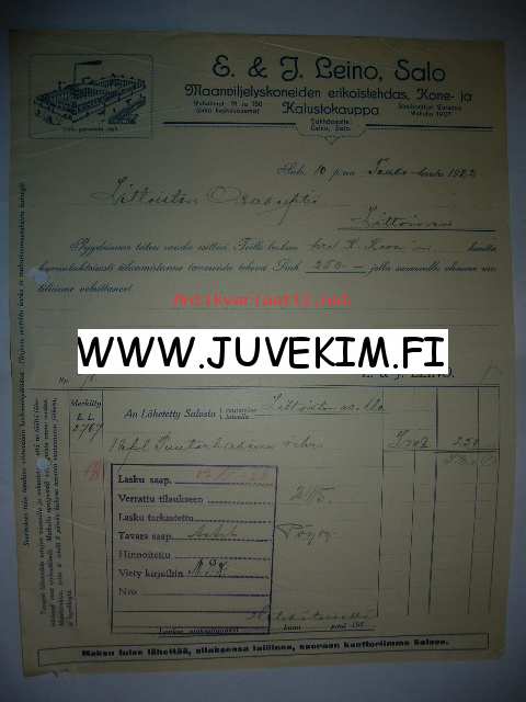 E. & J. Leino Salo Maanviljelyskoneiden erikoistehdas, Kone- ja Kalustokauppa Salo 10.5.1922 -asiakirja
