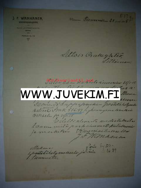 J. F. Wanhanen Kangaskauppa 28.1.1915 -asiakirja
