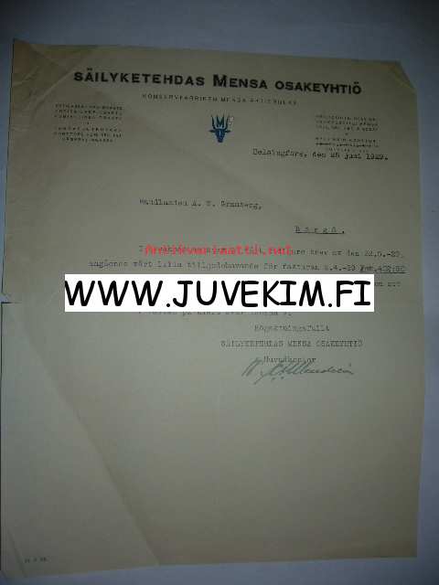 Säilyketehdas Mensa Osakeyhtiö Helsingfors/Helsinki 25.6.1929 -asiakirja