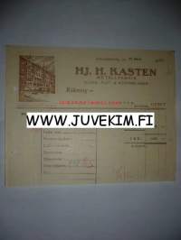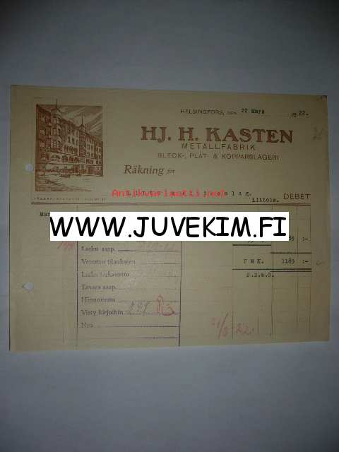 HJ. H. Kasten Metallfabrik Helsingfors/Helsinki 22.3.1922 -asiakirja