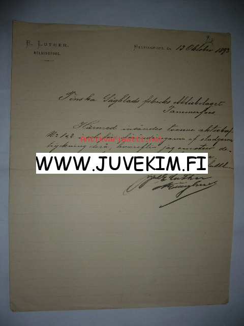 E. Luther Helsingfors/Helsinki 13.10.1893 -asiakirja