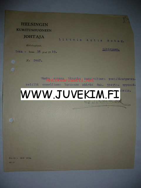 Helsingin Kuritushuone Johtaja Helsinki 15.10.1919 -asiakirja
