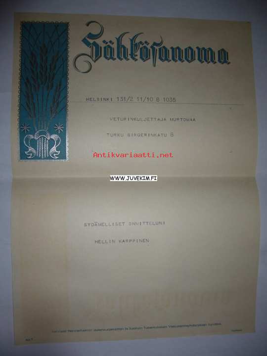 Veturinkuljettaja Murtomaa Helsinki -sähkösanoma