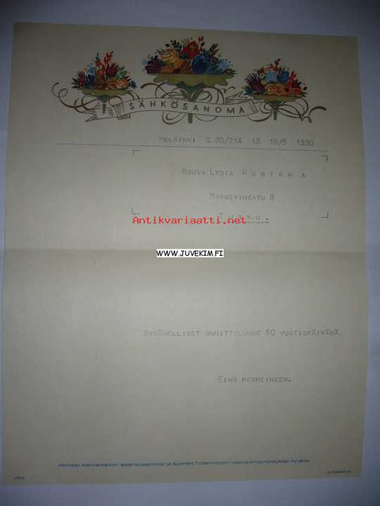 Rouva Lydia Murtomaa Helsinki -sähkösanoma