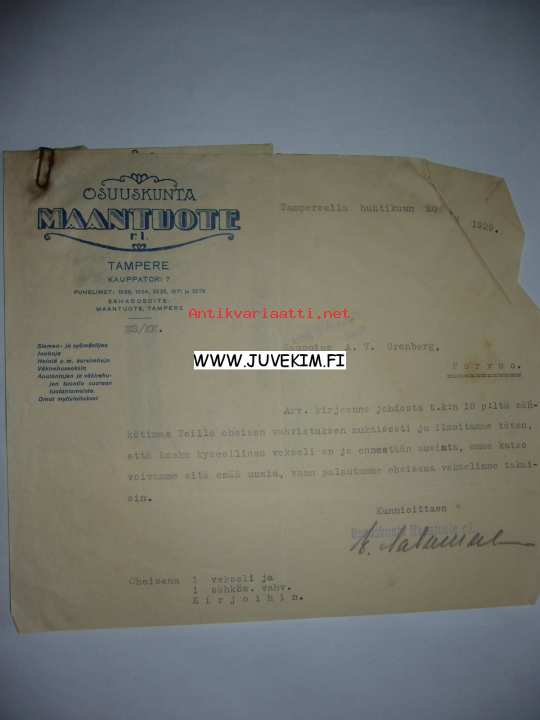 Osuuskunta Maantuote Tampere 20.4.1929 -asiakirja