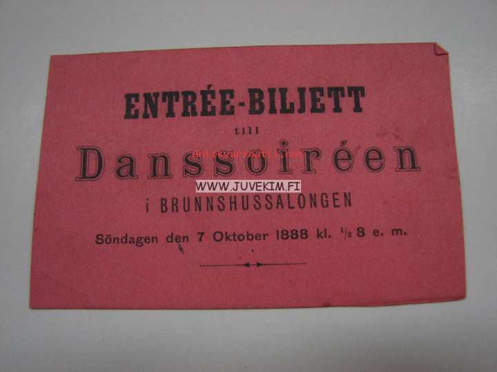 Entrée-biljett till Danssoiréen i Brunnshussalongen 7.10.1888