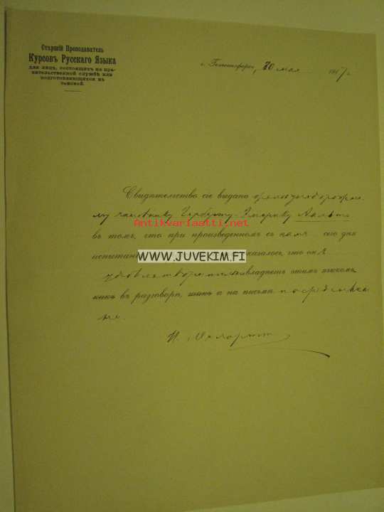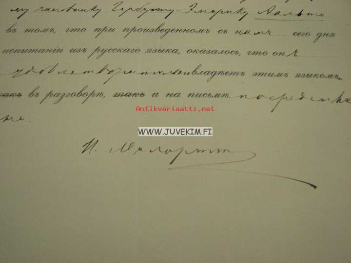 Herbert Emerik Aalto -todistus venäjänkielen kurssista 1917, allekirjoitus Melartt