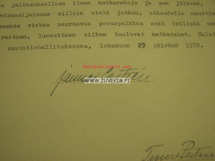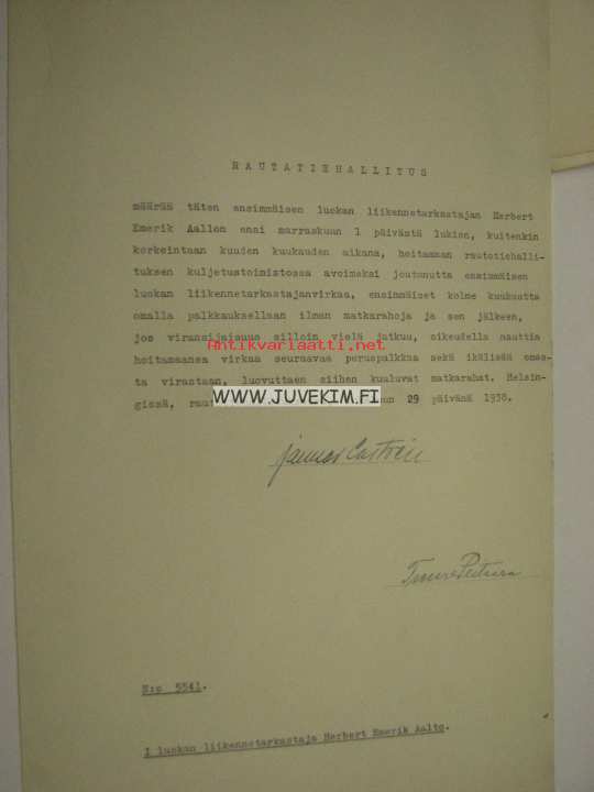 Herbert Emerik Aalto -asiakirja Suomen Valtion Rautatiet Pääjohtaja 1938