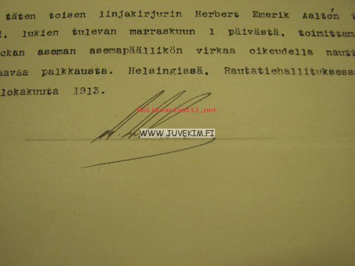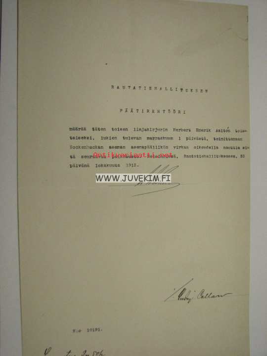 Herbert Emerik Aalto -Rautatiehallituksen määräyskirja 1913 -Sockenbackan aseman päällikkyys