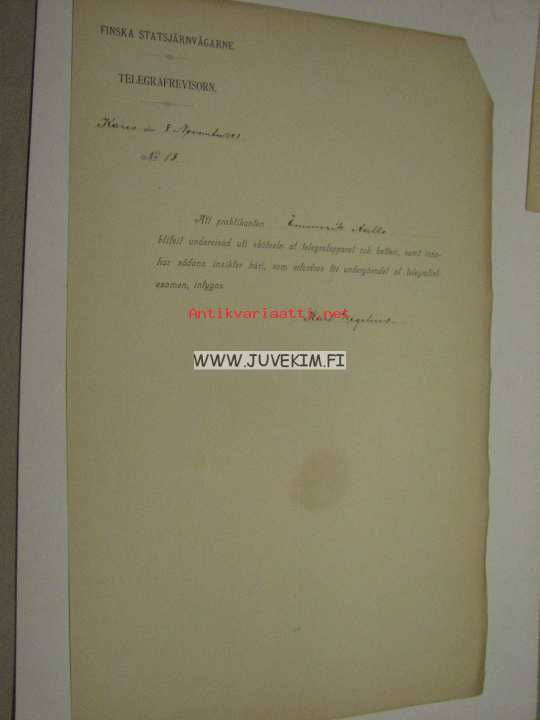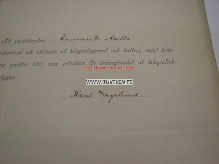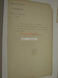 Herbert Emerik Aalto -Valtion Rautatiet asiakirja, todistus telegraafilaitteen hoidon osaamisesta Karjaa, 1901