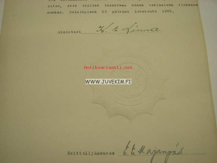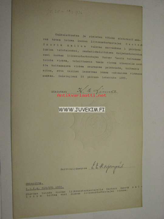 Herbert Emerik Aalto -Suomen Valtion Rautatiet, määräyskirja 1935, allekirjoitus Ministeri K.E. Linna