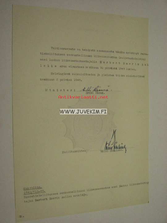 Herbert Emerik Aalto -Suomen Valtion Rautatiet, ero virasta, allekirjoitus ministeri Erkki Härmä