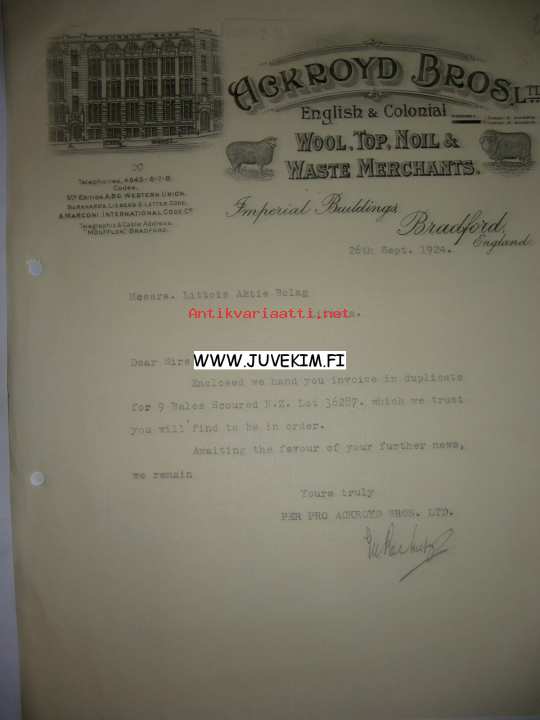 Ackroyd Bros. Ltd Imperial Buildings Bradford 26.9.1924 -asiakirja