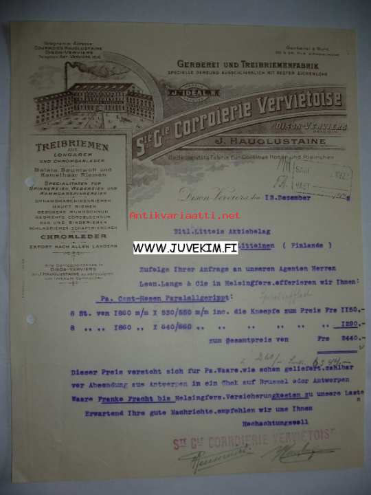Gerberei und Treibriemenfabrik Dison Verviers 12.12.1922 -asiakirja