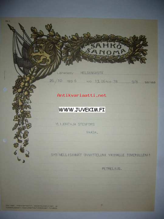 Ylijohtaja Stenfors Helsinki 26.10.1936 -sähkösanoma