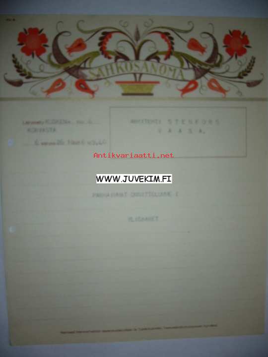 Arkkitehti Stenfors Koskenkorva 26.10.1936 -sähkösanoma